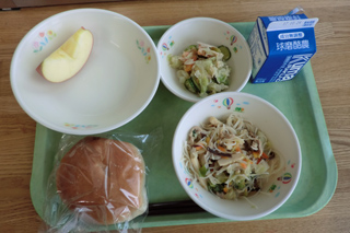 今日の給食 投稿日時 : 2017/10/18 ei/ho ★米粉パン★牛乳★焼きビーフン★バンバンジー★りんご今日のくだものは、りんごです。りんごがおいしい季節になりました。栄養たっぷりなので、一日1個食べるとお医者さんがいらないともいわれています。おなかの掃除をする食物繊維も入っています。