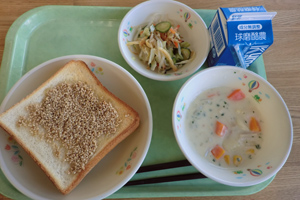 今日の給食 投稿日時 : 2017/10/23 ei/ho ★セサミトースト★牛乳★ニョッキのクリーム煮★かみかみあえ今日はごまを使ったトーストです。給食センターで作りました。ひとつの鉄板に8枚しかおけないので、何回も焼きました。パンにごまの入った調味料を塗るのにも時間がかかります。今日は3人で塗ってくださいました。時間もかかるので、いつもより1品少ない給食になりました。