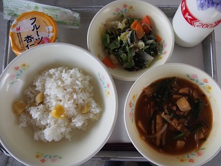 今日の給食 投稿日時 : 2015/09/18 ei/ho ★栗ごはん★牛乳★たんたんみそ汁★青菜とちりめんの中華和え★フルーツ杏仁今日は、「ふるさとくまさんデー」ということで、秋の味覚『栗』の紹介でした。なんと熊本県は、栗の生産量が第2位だそうです。ちなみに今回の栗ごはんに使われていた栗は、球磨村でとれたものでした。とても甘くておいしかったですね。秋には栗のほかにもくだものやきのこなどおいしい食べ物がたくさんあります。秋の食べ物を探してみるのも良いですね。