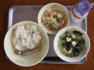 今日の給食 投稿日時 : 2016/03/17 ei/ho ★麦ごはん★牛にゅう★みそ汁★焼きししゃも★じゃがいものごまネーズ和え今日は「焼きししゃも」でした。みなさんししゃもを骨までまるごと食べることができましたか?ししゃもはまるごと食べられることができ、成長に大切なカルシウム補給をすることができますよ。
