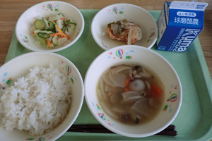 今日の給食 投稿日時 : 2017/10/24 ei/ho ★麦ごはん★牛乳★チキン南蛮★こんにゃくサラダ ★いちょう葉汁今日は熊本県の郷土料理「いちょう葉汁」です。上益城地域の郷土料理で、成人のお祝い料理です。野菜をイチョウ切りにし、ぎんなんのかわりに大豆を入れます。するめも入っているので、だしが出ておいしくなります。