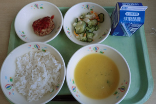 今日の給食 投稿日時 : 2018/07/10 ei/ho ★麦ごはん★ハンバーグ★ツナサラダ★コーンスープ今日は、小学3年生のリクエスト給食です。配膳のときから「おいしそう」「好きな物がある」ととても喜んでいました。今日でリクエスト給食が終わりだと伝えると、来年もしてほしいとの声でした。「食」についてたくさん勉強して、栄養バランスのとれた献立を考えてほしいです。