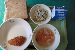 今日はパンが主食なので、よくかんで食べてもらおうとごぼうを使ったサラダにしました。歯が抜けている人もいましたが、よくかんで食べていました。もうすぐ今年度の給食が終わります。よくかんで食べる習慣が身に付くといいなあと思いました。