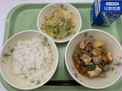 今日の給食 投稿日時 : 2021/03/16 tei 今日は朝から雨がパラつき、曇りの天気でした。 今日の献立は 麦ご飯、牛乳、筑前煮、キャベツのごまあえでした。 「がめ煮」や「炒り鶏」とも呼ばれており、福岡県の代表的な郷土料理です。 筑前煮には、人参やれんこん、こんにゃくなど名前に「ん」のつく食べ物が多く入っていることから 運がつく縁起物とも考えられています。 大きな釜で作る煮物は色々な食材のうまみが混ざり合い、おいしく仕上がります。