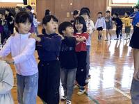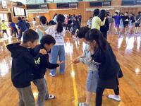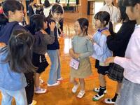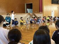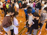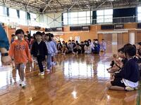 まずは体育館で見知り集会。児童会の運営委員の進行で、歓迎のパフォーマンスやゲームをして楽しみました。また、1年生は好きな食べ物などを一人ずつ自己紹介で話してくれました。