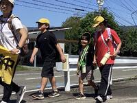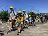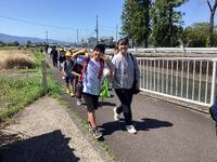 集会のあとは遠足へ出発! 本当はグリーンパレスの芝生広場に行くはずでしたが、前日までの長雨で各所に水たまりができており、残念ながら目的地変更・・・でも天気は良かったので周辺を少し歩いて中学校へ向かいました。