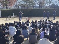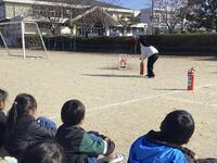 避難後は上球磨消防署東分署の署員の方からお話を伺ったり、消火器の使い方の説明を聞いたりしました。水消火器を使って実演訓練もしました。いざという時の備えとして大事なことですが、その前に「火を子どもだけで扱わないこと」「火事を見かけたら大きな声で近くの大人に知らせること」もしっかり覚えておいてほしいですね。