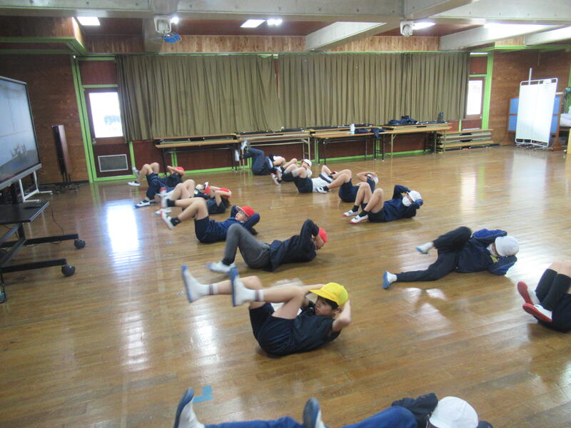 室内で筋力アップトレーニングに励んでいます。筋持久力も付けて、体力向上を目指します!