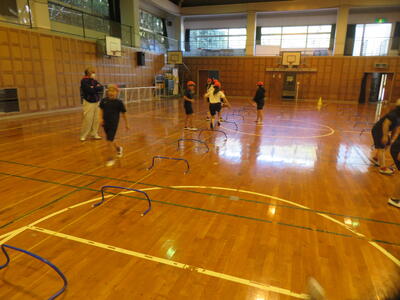 体育では、体育館でハードルを使ったリレーをしました。