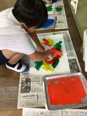 好きな型紙を作って、ならべたりかさねたりしながら、カラーインクをころころ、ころころ・・・