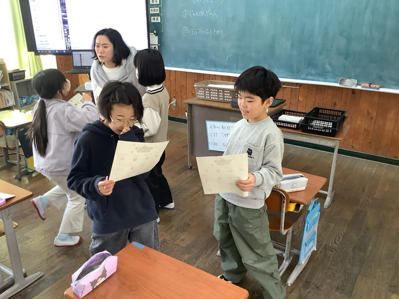 外国語活動の時間では、相手に好きな果物や色、キャラクターを尋ねたり、ビンゴゲームやアルファベット探しに挑戦したりしました。相手と楽しくコミュニケーションをとることができました