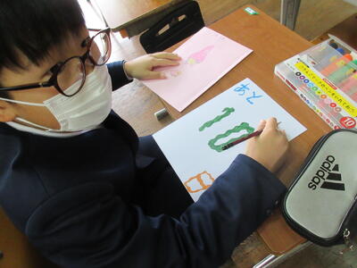 そして、書写の授業では書き初めをしました。「正月」の2文字を集中して書くことができました。