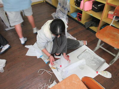 来週には液体粘土が乾き、布やひもなどが、普段では固定できないような形で固められます。そしてそれらを材料にして、想像力をはたらかせて各々の作品を制作します。