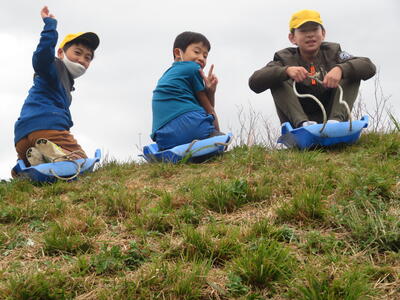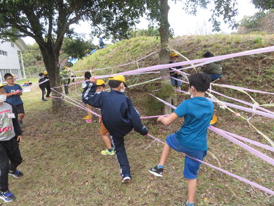 スズランテープを使ってのクモの巣作り、坂道を利用したペットボトルボーリング、草スキーの3つの遊びをしました。