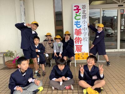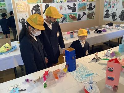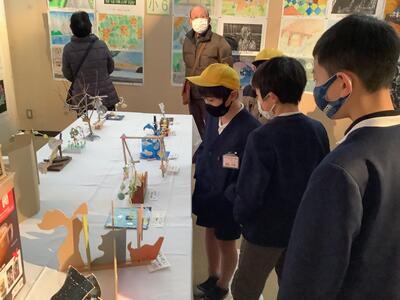 芦北町内の小中学生の絵画や工作の作品を見て、「よくできてるな。」「じょうずだな。」と感心しながら見学していました。