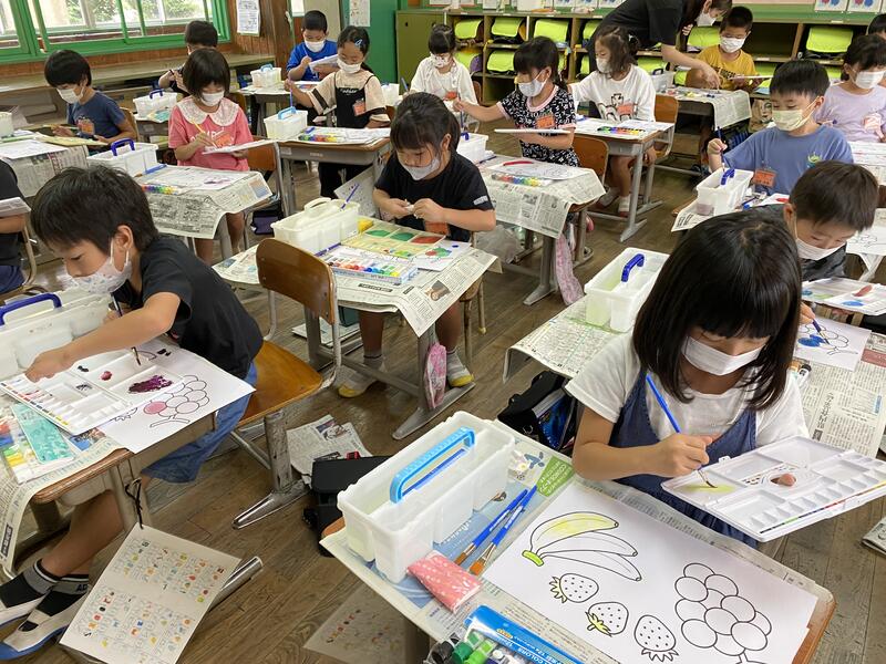 16日(火)の図工の学習では、初めて絵の具を使って色をぬりました。初めての絵の具に大興奮でした!