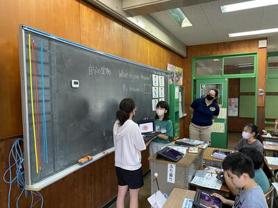 外国語の授業では、「私の宝物」を英語で紹介しています。宝物の画像をタブレットで検索したり、写真を撮ったりして、分かりやすく相手に伝えています。どの子も意欲的に英語を使い、友達と交流している姿が見られました。