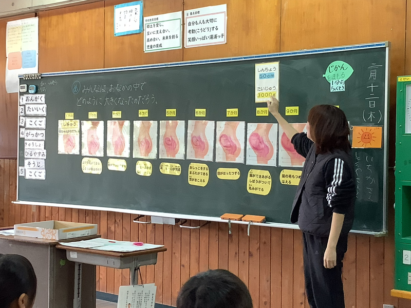 命の始まりやお腹の中の赤ちゃんの様子について知るとともに、保護者から妊娠・出産の話を聞き、自分が母親のお腹の中で大切に育てられてきたことを学びました。