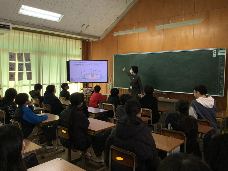 自分自身を大切にすることを通して、性被害や性加害の当事者とならないために、他者との適切な距離感の保ち方や思いの伝え方、SNSで注意することなどを学びました。