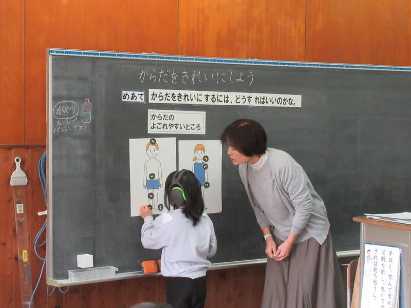 体のよごれやすい部位や、汚れの原因について考え、体を清潔にすることの大切さと方法について学びました。