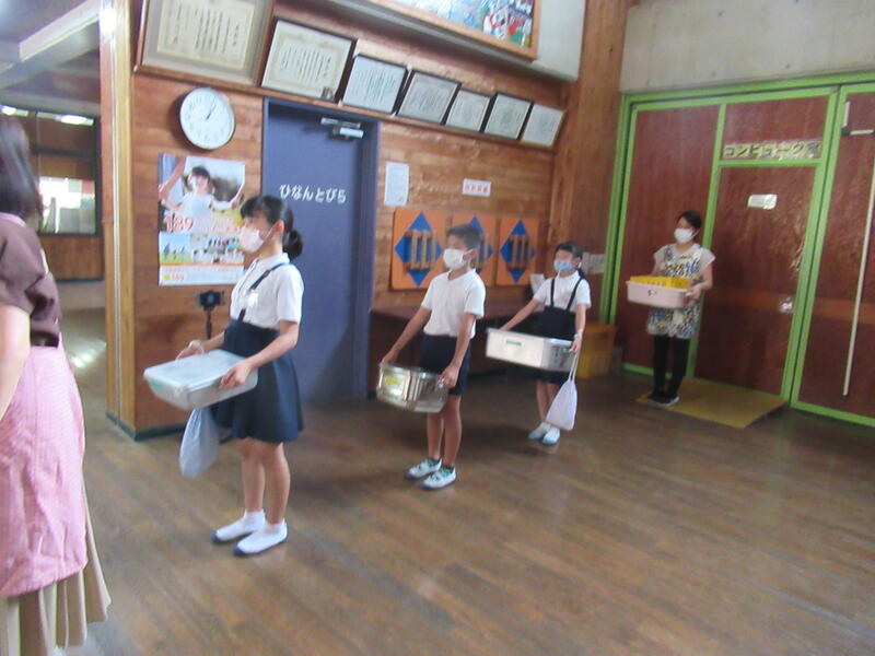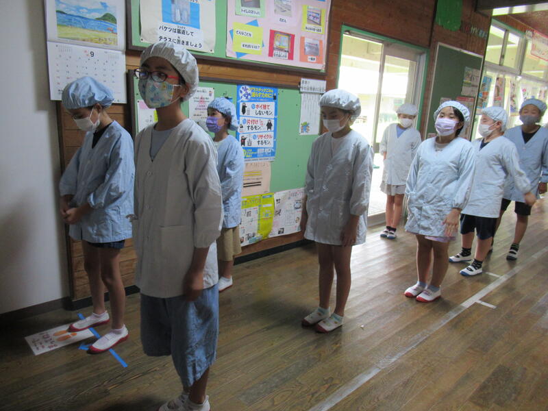 給食の時間は、全クラスが同じ場所に給食を取りに行きます。