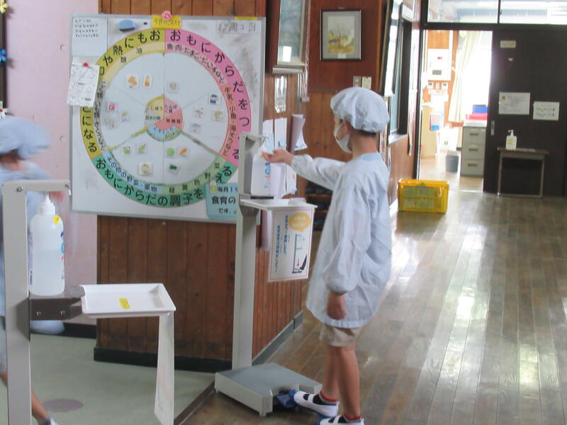 給食室の入口での消毒も忘れません!