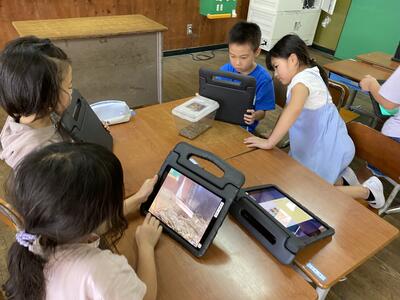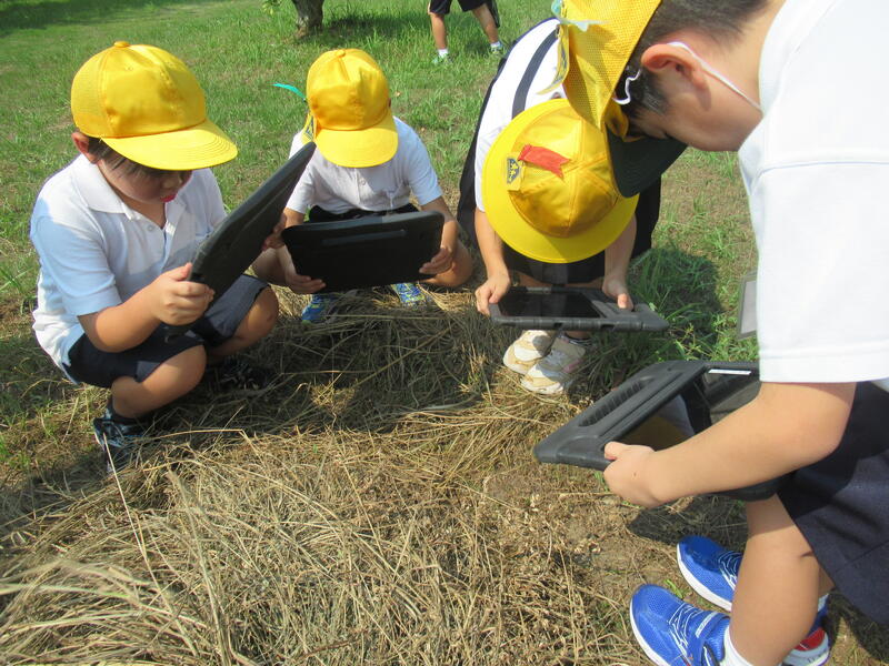 グループごとに、図鑑やタブレットで世話の仕方を調べて草を集めたり土を入れたりと試行錯誤しながら世話をしています。