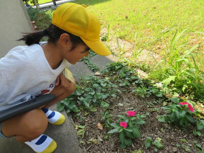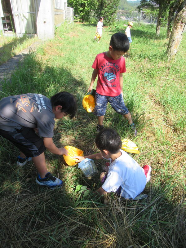 1年生の生活科「いきものとなかよし」の学習で、虫を育てることにしました。飼育ケースに草や土などの虫のお家を準備してから、虫を探しました。跳んで逃げるバッタを追いかけて追いかけて、捕まえていました。これから大事に育てたいと思います。