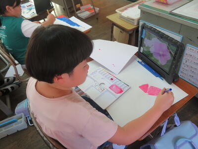 図画工作では、好きな色ですてきな花を描く活動に取り組んでいます。絵具を混ぜて色を作ったり、重ね塗りなどの技法を工夫したり、様々な創意工夫が見られます!