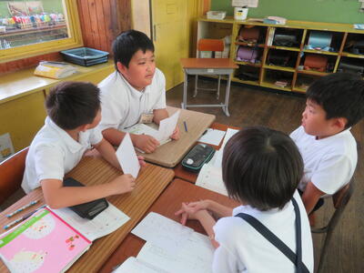 国語では、音楽発表会の練習を頑張れるような合言葉を決めるために、グループで話し合いをしました。司会も自分たちで行う姿から、自主性の成長を感じます!