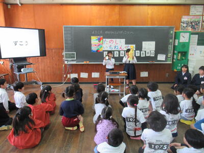 3月4日に、保育園の園児さんたちを招待して「がっこうはたのしいよのかい」を行いました。子どもたちと考えて、学校の行事や勉強の紹介、じゃんけん列車、かるた、おりがみをしました。園児さんたちも楽しんでくれました。1年生も、優しく教えていて、1年間の成長を感じました。