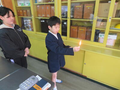 はじめに、マッチを使ってアルコールランプに火をつける活動を行いました。初めてマッチを使う子も何人かおり、少し緊張した様子でしたが、友だちと声をかけ合いながら、慎重に取り組んでいました。
