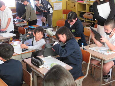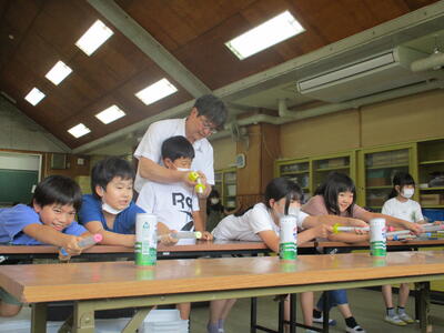 理科の学習では、「空気や水の性質」について学習しています。8日(木)の授業では、閉じ込めた空気を圧すとどうなるのかを考え、授業の最後には空気鉄砲での的当てをしました。空気鉄砲から勢いよく玉が飛び出して、的に当たると大喜びする子どもたちの笑顔が絶えない1時間でした。