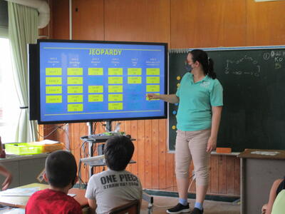 1学期に学んだ単語や会話を生かした「クイズ大会」をしました。クイズをALTのデイラン先生が考えてくださって子どもたちは楽しく活動しました。グループ対抗のポイント制のゲームだったので、みんなで答えを相談する場面も見られ、こどもたちの笑顔が広がりました!これからも楽しく学んでいきたいです。