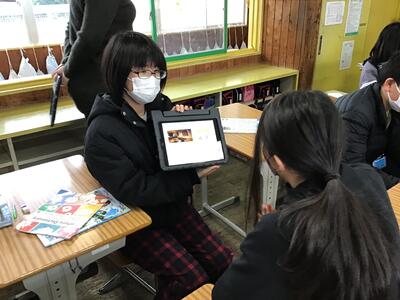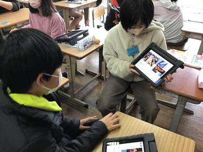 外国語の授業では、「私の宝物」を英語で紹介しています。宝物の画像をタブレットで検索したり、写真を撮ったりして、分かりやすく相手に伝えています。どの子も意欲的に英語を使い、友達と交流している姿が見られました。