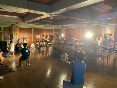 写真は、多目的ホールでライトを太陽に、ボールを月に見立てて月の形についての実験をしています。