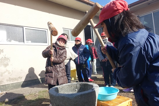 12月13日(木)公民館で行われた島の「もちつき」に参加しました。最近では杵と臼で餅をつく機会も少なくなり、子どもたちにとっては貴重な地域の伝統文化の体験学習です。つきたてのお餅で作ったぜんざいや大根餅をごちそうしていただき、おなかいっぱいになって学校に帰りました。
