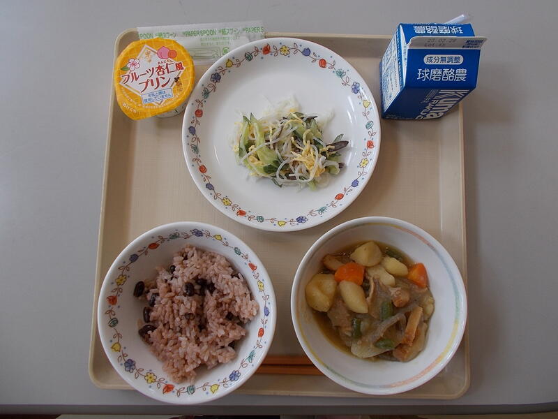 せきはん・牛乳・にくじゃが・はるさめサラダ・フルーツあんにん