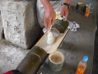 はじめに、地域の人や保護者に教わりながら、米をとぎ、たかんぽを作りました。そのあと、といだ米をたかんぽに入れました。