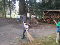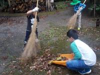 一の宮神社では、竹ぼうきで境内をはわき、落ち葉を集めました。