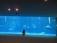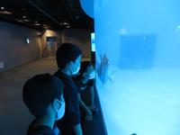 かごしま水族館に到着。館内を班別に見学しました。黒潮大水槽には、ジンベイザメやカツオ、マグロが群れて泳いでいました。