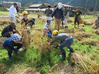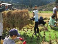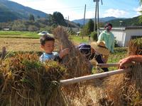台風や雨で延期した稲刈りを行いました。秋の日差しを浴び、稲を刈るたびに額には汗がにじみます。延期が重なり、参加者は少なかったのですが、稲刈りから竿がけまでたっぷりと体験することができました。
