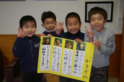 1年生4人が、1月10日(金)に書き上げた書き初めの作品を見せに来ました。3学期の始まりにあたり、3学期の抱負を「仲よく遊ぶ」と表現しました。4人の笑顔が絶えない3学期にしたいものです。