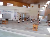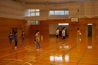 登校後の身支度を終えた子供たちが体育館にやってきます。体育館に来た人から順にコートやボールの準備を行い、A、Bの2チームに分かれてドッジボールをしています。