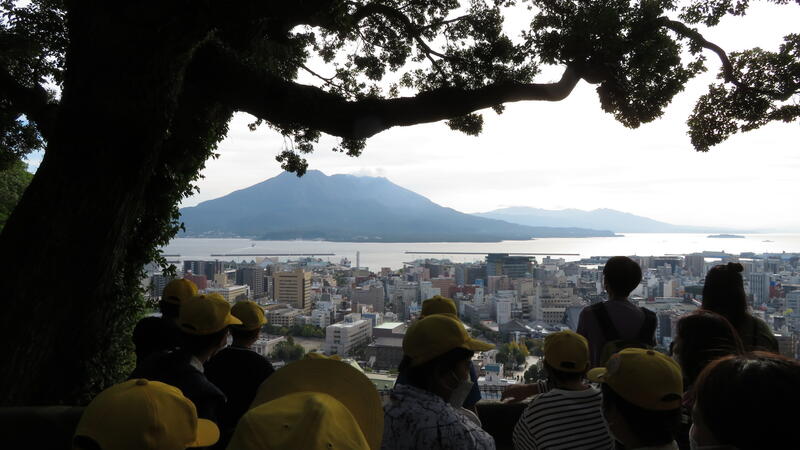 高台から見た朝の桜島 班別自主行動 メルヘン館