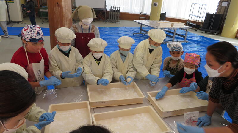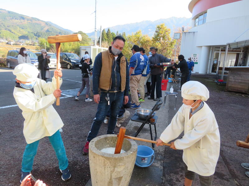 もちつきは、今年は全校児童で行いました。JA青壮年部の皆さんと一緒に、おいしいおもちをたくさんつくことが