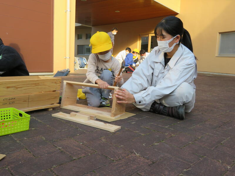 午後からは木工教室。南稜高校の生徒さんたちに教わりながら、おもちゃのカメラやブックエンド、ミニチェアー、ミニベンチ、プランターなどを作りました。終わる頃にはすっかりお兄さんお姉さんたちと仲良くなって、楽しく活動できました。南稜高校の皆さん、ありがとうございました。