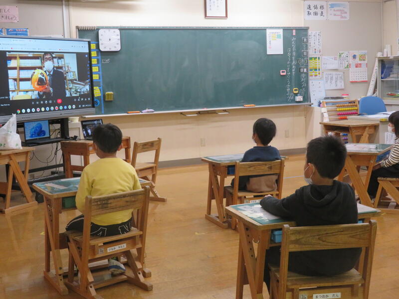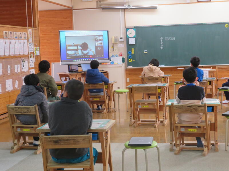 進行役の高学年の子どもたちの顔が電子黒板に映し出されて、全校朝会が始まりました。誰かが発言する度に、進行役の子がニコニコする様子がしっかり映っていて、下の学年の子どもたちも「あっ、笑ってる!」と大喜び。なんともほのぼのとして、かわいらしい湯山っ子たちでした。