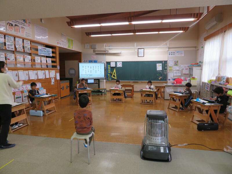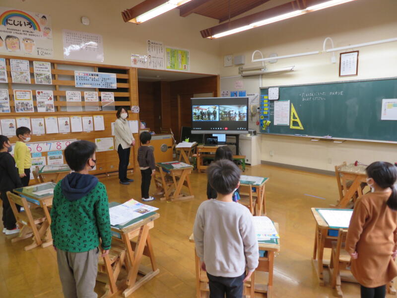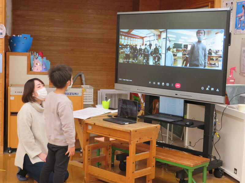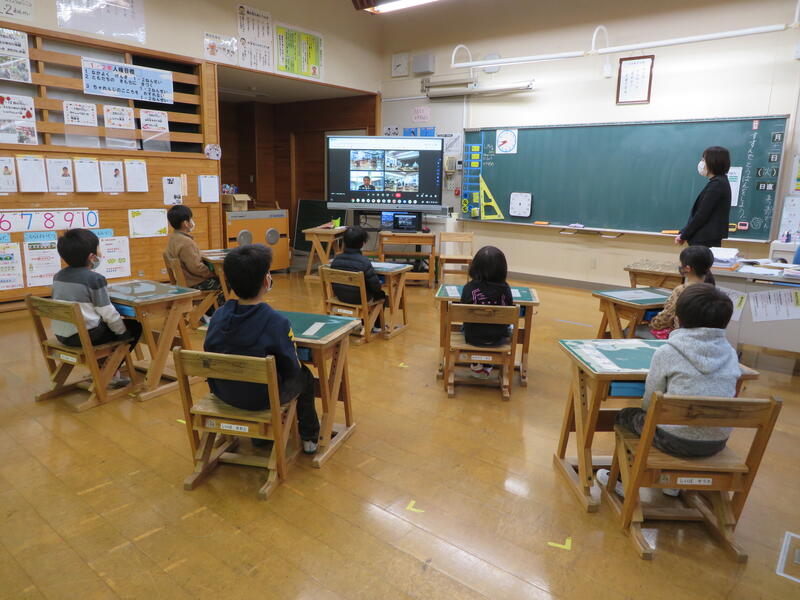 1、2年生は、岩野小学校の2年生とオンラインで結び、生活科で行った村たんけん発表会をしました。