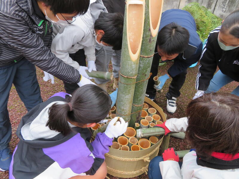 ドラム缶に竹を敷き詰めて、水を入れ、そこに松や竹、南天、裏白などを活けていきます。